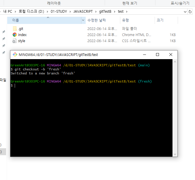 git init -> 이 폴더를 이제 git으로 관리하겠다. 1번만 해줌(.git폴더가 생성됨-숨김파일보기)